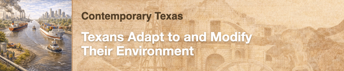 People and the natural environment have a big impact on one another. People must adapt to the environment—the climate, natural resources, and terrain—while they also modify it for their own purposes. In this experience, you will learn about the Houston Ship Channel as an example of Texans interacting with the environment.