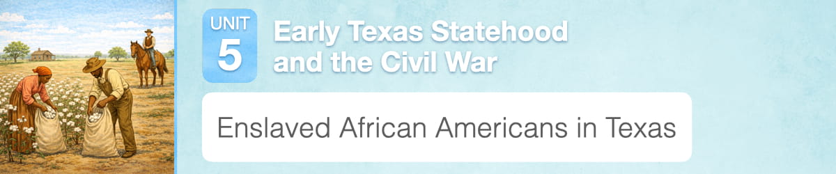 As Texas grew, so did the number of enslaved African Americans. By 1850, the number of enslaved people in Texas was over 58,000 and by 1860 that number rose to over 180,000. At that time, nearly one-fourth of the families in Texas enslaved at least one person. In this experience, you will learn about slavery in Texas.