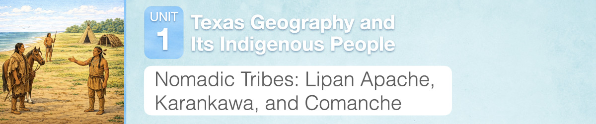 Some Native peoples were nomadic, which means they moved from place to place instead of living in one fixed settlement all year. In this lesson, you will learn about three Native groups whose homelands included parts of Texas or who moved through parts of Texas during the year: the Lipan Apache, the Karankawa, and the Comanche.