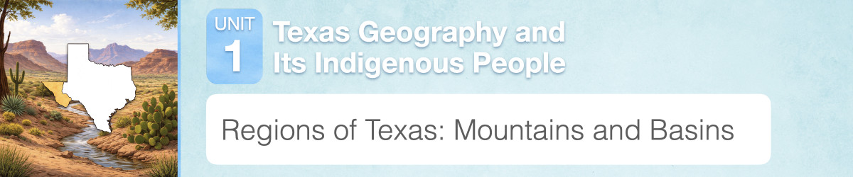 Texas is divided into four regions—the Mountains and Basins, the Great Plains, the North Central Plains, and Coastal Plains. The regions are determined by the physical geography, such as landforms, climate, and vegetation. In this experience, you will learn about the Mountains and Basins.